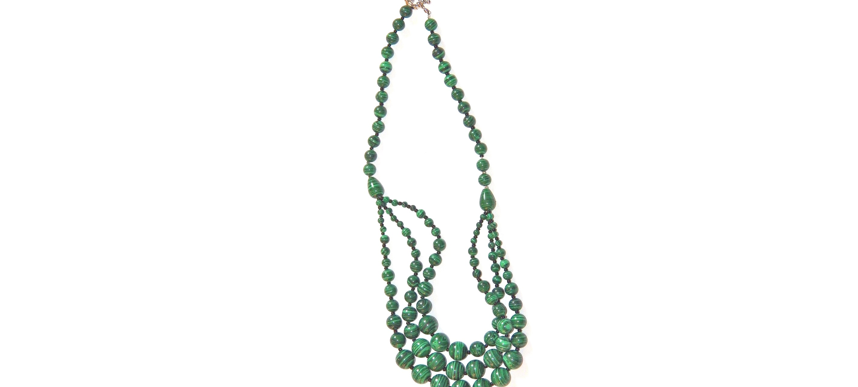 Description: an opaque gem with a strong bluish green to green color. It typically shows curved or circular banding in varying shades of green. It is considered an extra-care gem.